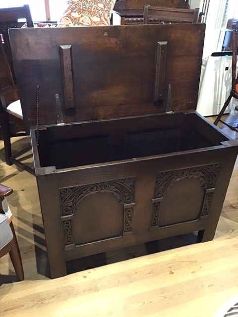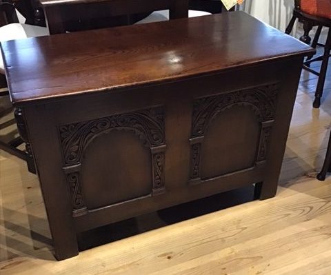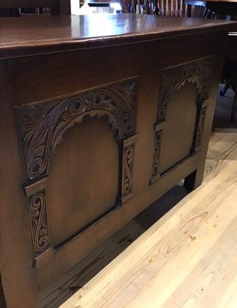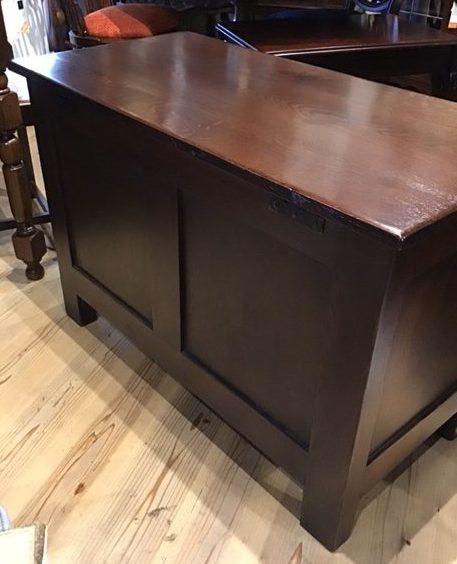 コファーとは、蓋付きの収納箱を指し、収納家具の原型とも言われています。主にブランケットなどを入れベッドの足元に置きますが、(内部最大寸法:815×365×深さ465)リビングの腰窓の下などの雑貨やお子様のおもちゃなど収納に活躍します。頑丈な作りなので、大人が座っても大丈夫!脚カットしてベンチとしても良いですね!(脚部の高さは、100mmの角脚なので→90mmまでしたらカットが可能です、ご相談ください。)