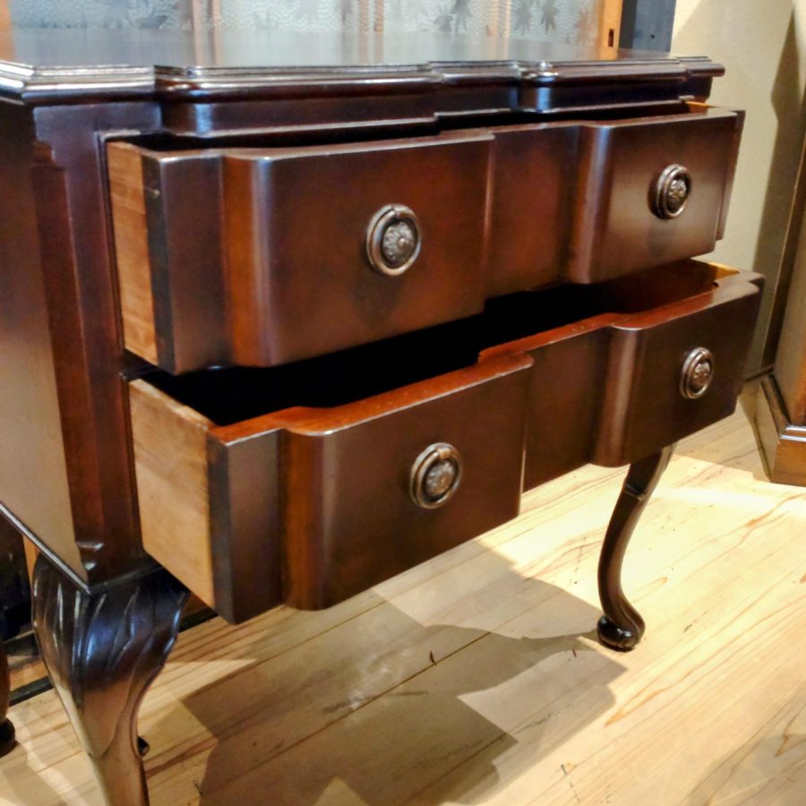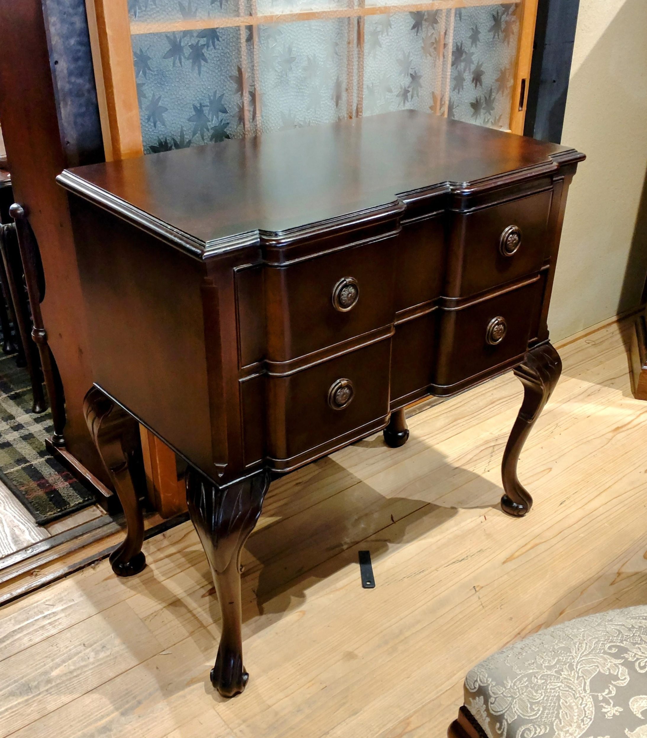 ウォールナット材のブレイクフロントチェストです。引出しの正面が凹凸になっています。削り出しなのでとても厚い材が必要です。贅沢ですね。コンパクトですが形がオブジェ的なデザインなので、壁のインテリアが素敵になる逸品です。