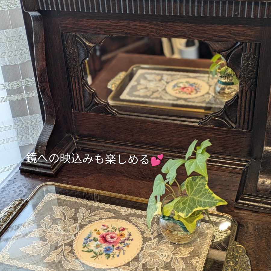 「ペディスタルカップボード」とは、木製の扉を備えた四角い箱状の家具で、主に食品や壺などを収納していたものだそうで、デザインは様々ものがあります。立ち上げの所に鏡(鏡は新調してます!)が付いており、鏡の四方にローレリーフが施されているもの可愛らしく、飾ったものが映り込むのも魅力的です。脚部は、Inverted Cup Leg(インバーティドカップレッグ)とい17世紀、ウィリアム&メアリーの治世に流行した英国の特徴的な装飾で、カップを逆さにした意味です。木製の扉を開けると棚板は1枚→外すことは可能です!目隠し収納は生活の中で嬉しいですね。