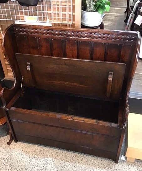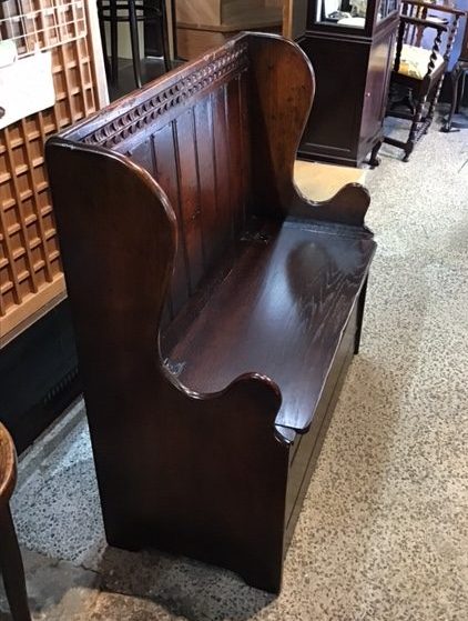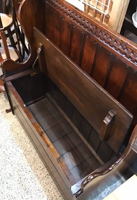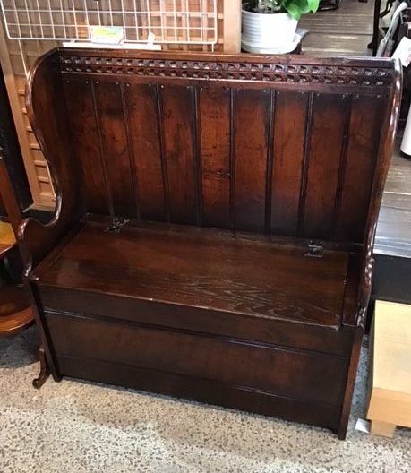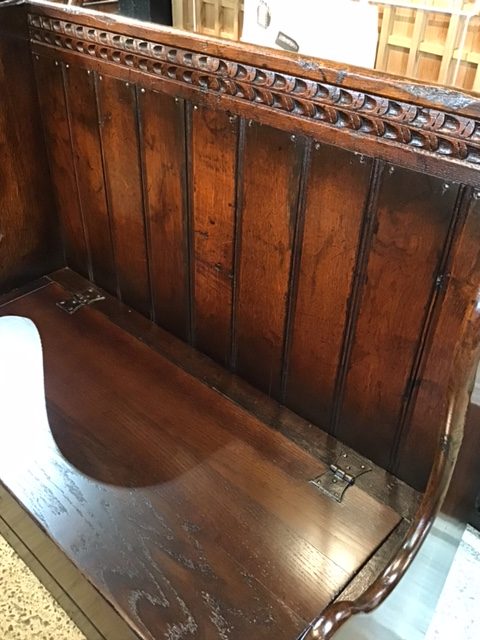 6世紀後半のエリザベスアン様式を忠実に再現したホールベンチです。年代は1920年代、オーク材になります。玄関先や当時はお勝手口の側に置かれました。座面が開き収納にもなっております。サイズ感もコンパクトで、なんともアンティークらしい表情です。修復士お薦めの逸品です。