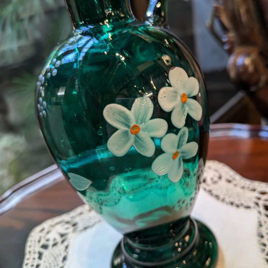 ヴィクトリア時代に作られた深いグリーンが美しいの手拭きガラスの水差しです。絵付けのお花模様は勿論ハンドペイントです。注ぎ口やハンドルの繊細さ、光を浴びた時にゆらゆらと光るアンティークガラスがなんとも言えず美しく、そのまま飾っても良し、お庭に咲いてる草花を生けてもいいですね♡